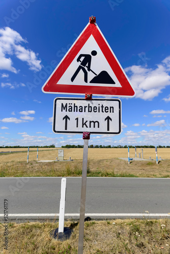 Verkehrsschild Vorsicht Bauarbeiten mit dem Zusatzschild Mäharbeiten