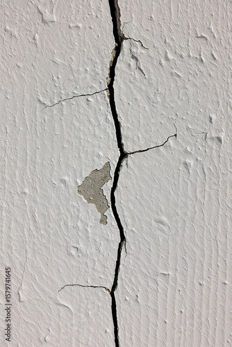 Vertical crack bisects a textured white wall, revealing damage and deterioration.