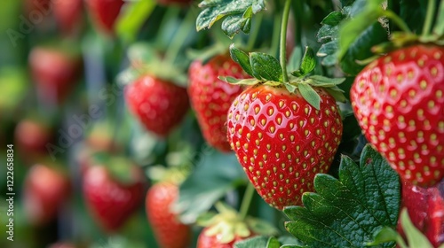 Vertical farming gardening concept. Fresh red strawberries growing on green vines in a vibrant field.