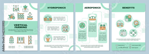 Vertical farming green brochure template, leaflet design with linear icons. 4 vector layouts representing types and benefits.