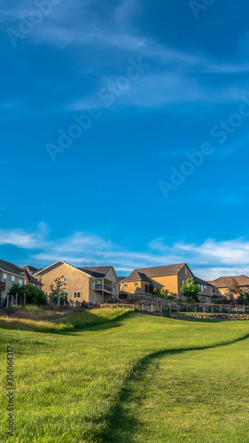 Vertical frame Exterior of houses in the suburbs with scenic view of recreational golf course