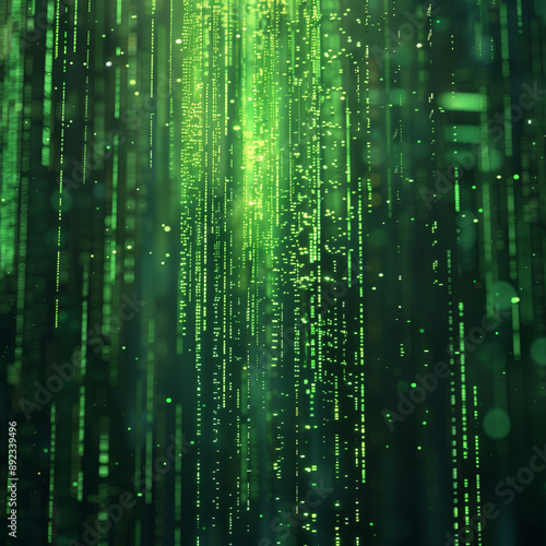 Vertical green digital lines and dots cascading, creating an abstract, matrix-inspired background