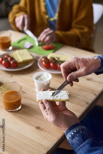 breakfast, food, morning, sandwich, senior, couple, home, butter, bread, retirement, closeup, drink, family, meal, healthy eating, vegetable, salad, nourishment, cooking, diet, fresh, vertical, snack, lunch, grandparent, retiree, grandmother, grandfather, husband, married, wife, love, togetherness, woman, man, caucasian, lifestyle, mature, elderly, old, pensioner, table, domestic life