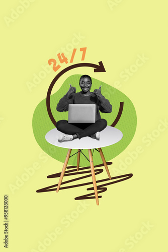 Vertical photo collage of happy american girl show thumb up 24 7 schedule support client service hold laptop isolated on painted background