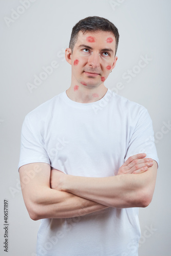 Vertical portrait of a disgruntled man covered in lipstick kiss marks isolated on gray background. Happy Valentine's Day.
