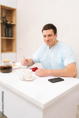 Vertical portrait of handsome male patient in medical coat smiling looking at camera resting, eating, gaining strength before long operation. Sick young man enjoy eating food sitting at table.