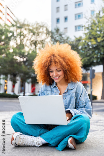 woman, vertical, student, latin, girl, laptop, curly hair, freelancer, working, online, smiling, outdoors, digital, technology, city, education, urban, cyberspace, young adult, workspace, remote, typing, learning, female, person, youth, connected, joyful, business, career, portable, working girl, productivity, creativity, afro, african american, ginger, computer, university, campus, brazilian, portrait