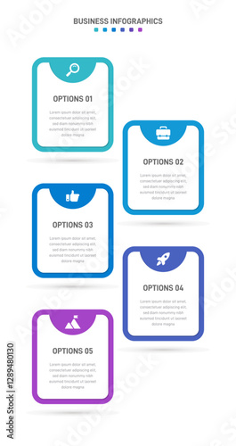 Vertical progress bar featuring 5 arrow-shaped elements, symbolizing the five stages of business strategy and progression. Clean timeline infographic design template. Vector for mobile presentation.