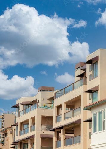 Vertical White puffy clouds Residential buildings with glass railings at La Jolla, Californi