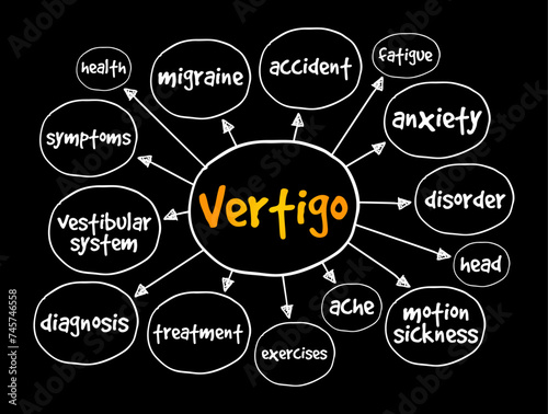 Vertigo is a sensation of motion or spinning that is often described as dizziness, mind map text concept background