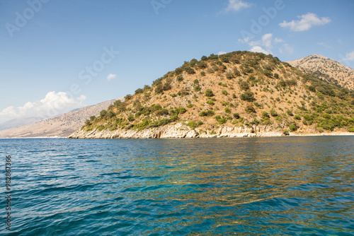 Very beautiful coastline on the Ionian Sea in Albania. The beach with fine sand in the mountains of Albania. Vacation at the sea.