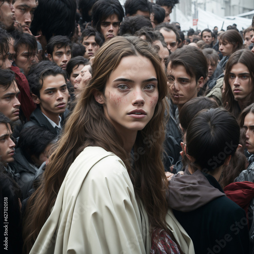 very beautiful young woman emerges from among the people