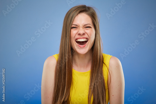 Very happy young lady in yellow dress with mouth open. isolated female portrait.