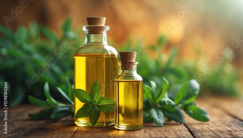 Vials of essential oils with fresh green leaves, natural remedy and aromatherapy concept. Therapeutic and wellness, health and relaxation. Botanical and herbal oil extracts.