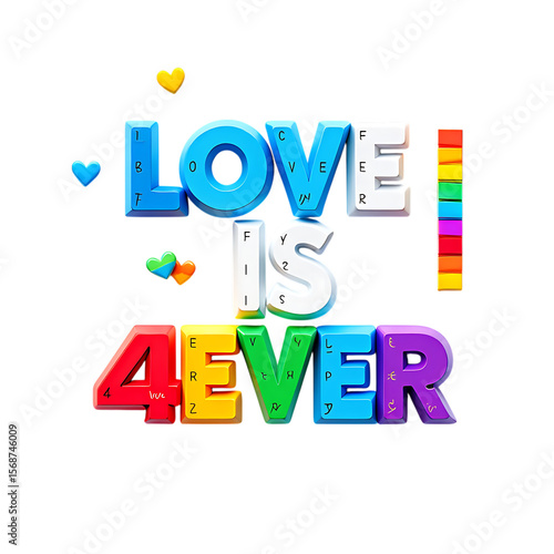 Vibrant 3D 'LOVE IS 4EVER' graphic with colorful rainbow spectrum letters and charming heart symbols, a joyful message of unity.