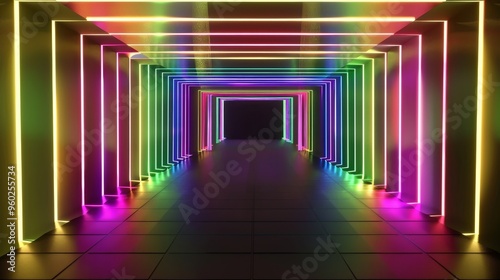 Vibrant 3D rendering of an abstract bright neon frame, featuring luminous neon lines forming a rectangular path, perfect for web backgrounds and laser show displays