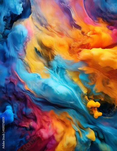 Vibrant abstract art featuring swirling colors of blue, orange, and purple.