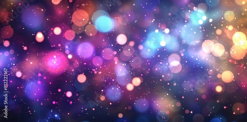 Vibrant abstract background featuring a colorful array of sparkling bokeh lights with subtle blurs and glows on a dark, gradient backdrop, perfect for festive or fantasy design elements