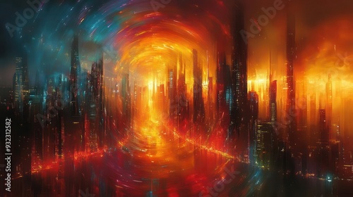 abstract, city landscape, neon, vibrant, futuristic, chaotic, energy, swirl, bold, colourful, dynamic, expressive, urban, modern, skyline, texture, movement