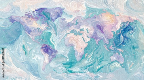 Vibrant abstract depiction of a world map featuring swirling colors of blue, purple, and peach. The unique design creates an artistic representation of global geography