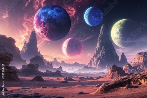 Vibrant Alien Landscape Featuring Cosmic Moons and Celestial Elements