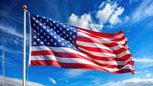 Vibrant American flag waving in the wind, with bold stars and stripes shining brightly against a clear blue sky, evoking feelings of freedom and pride.