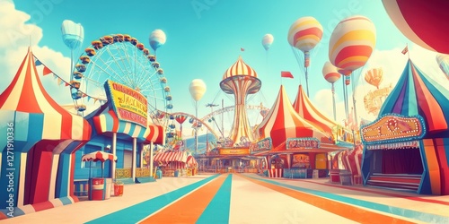 carnival, amusement, park, ride, ferris, wheel, tent, balloon, sky, circus, fair, attraction, colourful, vibrant, fun, entertainment, festival, game, booth, carousel, roller coaster, swing, tower, stripes, red, blue, white, orange, yellow, sunny, cheerful, joyful, whimsical, dreamy, surreal, fantasy, landscape, pathway, perspective, architecture, structure, design, graphic, illustration, artistic, artwork, bright
