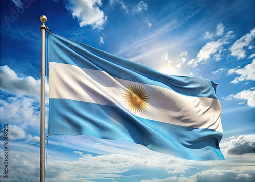 Vibrant Argentine flag waving in the wind against a bright blue sky, with subtle creases and folds, symbolizing national pride and independence.