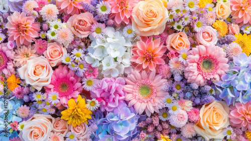 vibrant arrangement of colorful flowers including roses, daisies, and dahlias, creating cheerful and lively atmosphere. Perfect for spring or floral themes