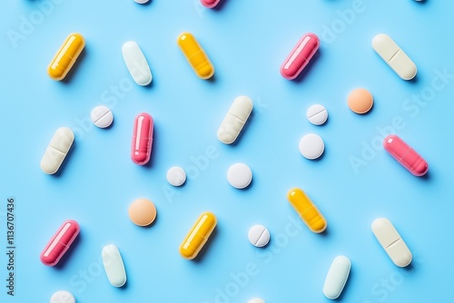 Vibrant arrangement of colorful pills and capsules on a blue background, showcasing a minimalist medical concept. HD, high-resolution image.