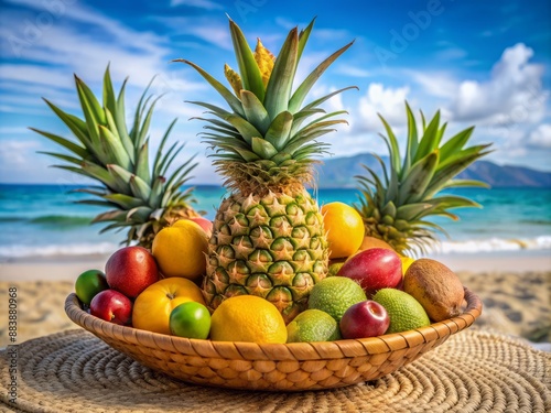 Vibrant arrangement of exotic tropical fruits such as pineapple, mango, and kiwi, beautifully displayed in a woven sea grass bowl on sandy beach shore.