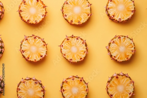 Vibrant arrangement of fresh pineapple slices on a sunny yellow background creates a cheerful summer vibe