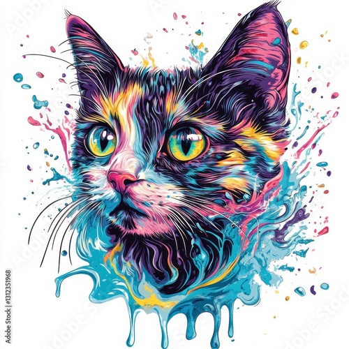 Vibrant artistic cat illustration with explosive colors and abstract splashes.