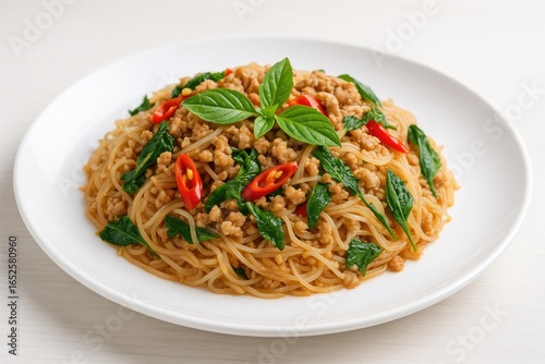 Vibrant Asian-style stir-fried basil and vermicelli served on an elegant white plate