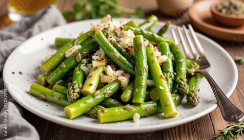 Vibrant asparagus and fennel saute on plate in cozy kitchen, culinary delight