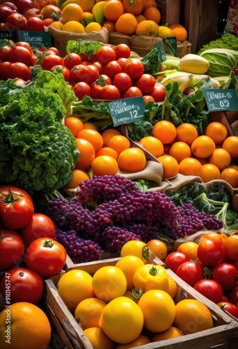 vibrant assortment fresh seasonal produce displaying colorful fruits vegetables rustic market setting, organic, variety, local, ripe, garden, herbs, leafy