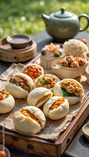 Vibrant assortment of bao buns on picnic table, culinary delight