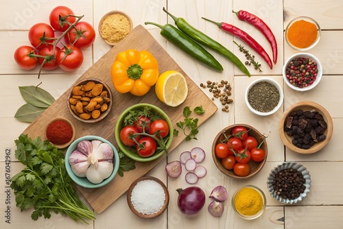 food, ingredient, spice, herb, vegetable, cooking, culinary, fresh, organic, healthy, diet, nourishment, favor, aroma, seasoning, epicure, kitchen, preparation, raw, natural, colourful, vibrant, overhead, topview, arrangement, variety, selection, assortment, background, table, wooden, tomatoes, pepper, chili, garlic, onion, lemon, cilantro, bay leaf, peppercorn, paprika, cumin, coriander, bean, nut, salt