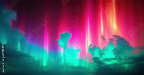 Vibrant aurora borealis illuminates night sky. Clouds reflect colorful light beams, creating stunning visual spectacle. Dramatic, ethereal beauty.