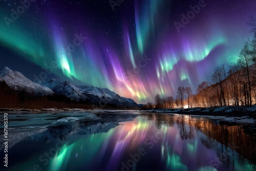 Vibrant aurora borealis reflected in a partially frozen river with snowcapped mountains