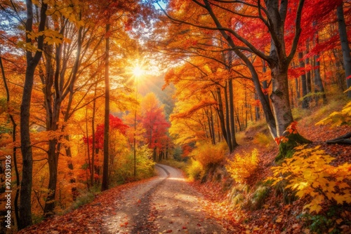 Vibrant autumn foliage surrounds a winding hiking trail, ablaze with warm golden light, showcasing nature's stunning diverse color palette of orange, red, and yellow hues.