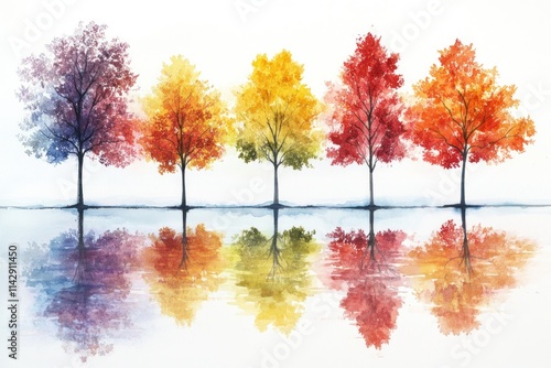 Vibrant Autumn Landscape with Colorful Trees and Their Reflective Image on Calm Water Surface Creating a Serene Atmosphere in Nature