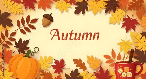 Vibrant autumn leaves frame a cozy scene with pumpkin, acorn, and warm drink perfect for seasonal greetings
