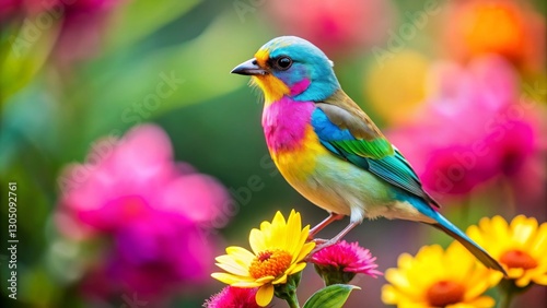 Vibrant Avian Amidst a Rainbow of Blossoms, a Delightful Scene of Nature's Colorful Artistry