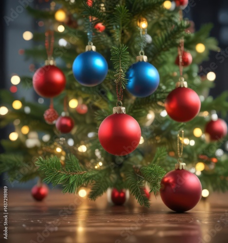 Vibrant baubles adorn a Christmas tree, bokeh lights glow , winter, pattern, illustration
