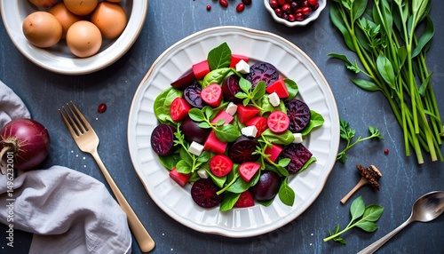 Vibrant beetroot salad with fresh ingredients kitchen table food photography bright lighting culinary art