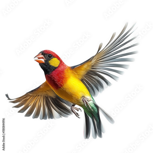 vibrant bird in flight. showcasing its colorful plumage with shades of red. yellow. and green the bird's wings are spread wide. emphasizing its dynamic movement and grace against a plain background th