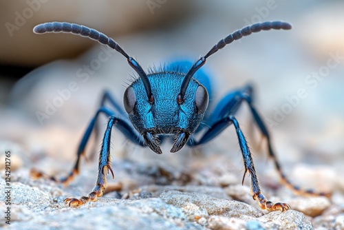 Vibrant blue ant observing its surroundings on a rocky surface in natural light
