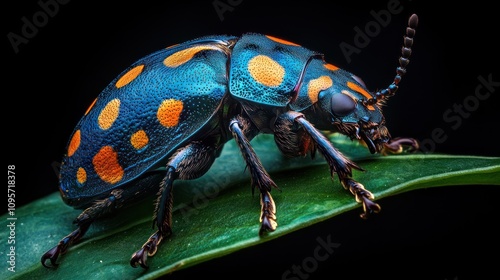 beetle, insect, bug, macro, photo, wildlife, nature, animal, closeup, colourful, vibrant, blue, orange, dot, spot, pattern, leaf, green, black, background, arthropod, carapace, antennae, leg, wing, body, eye, head, chested, abdomen, invertebrate, creature, fauna, flora, detail, sharp, sharpened, tropical, exotic, specimen, miniature, small, crawling, climbing, surface, texture, design, art, science