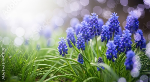 Vibrant blue grape hyacinths bloom in soft sunlight with a dreamy bokeh effect